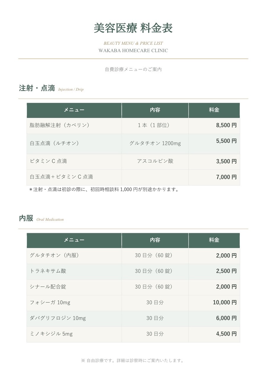 クリニックから半径16kmが目安です。訪問する医師が不在の場合はそれを超えることもできるので、お問い合わせください。 - 自費診療(美容医療)の最新の値段表です。